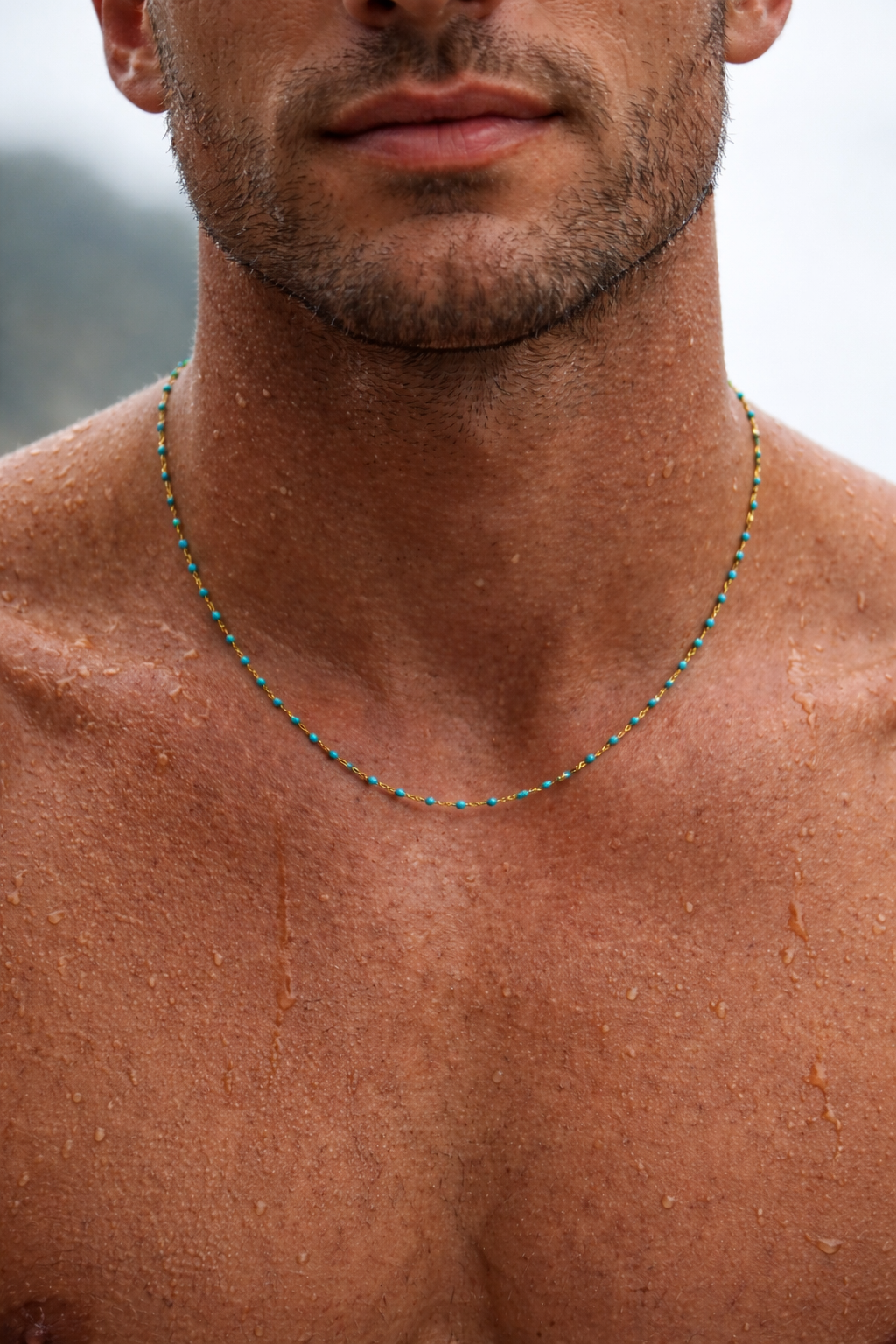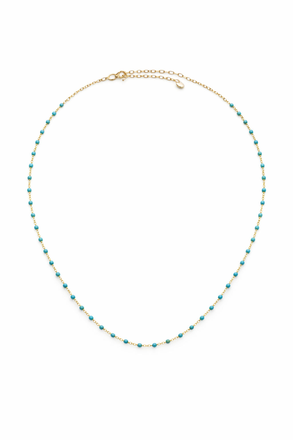 Colar em aço inoxidável dourado com pormenores turquesa.