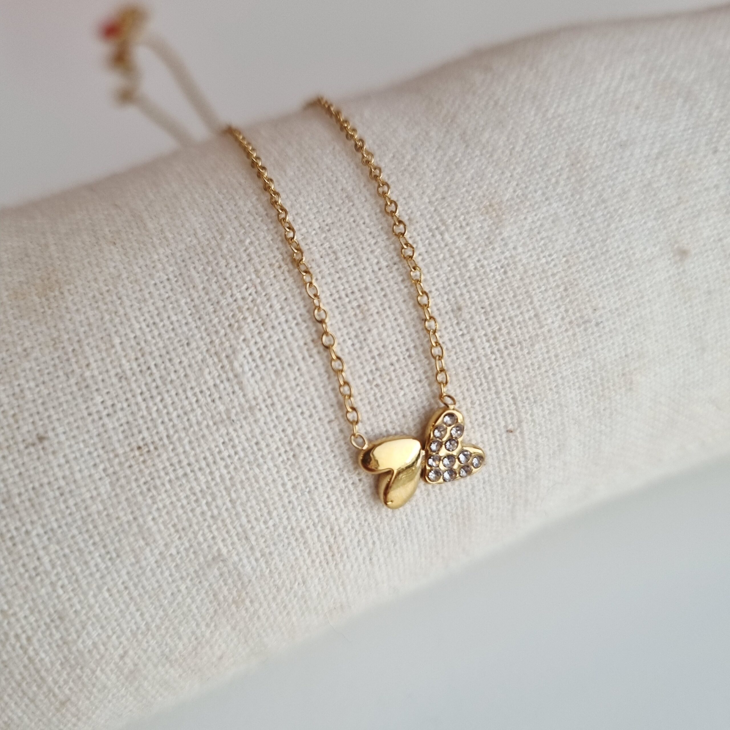 Colar em aço inoxidável com dois corações, dourado e com brilhos. Mede 40cm + 5cm.